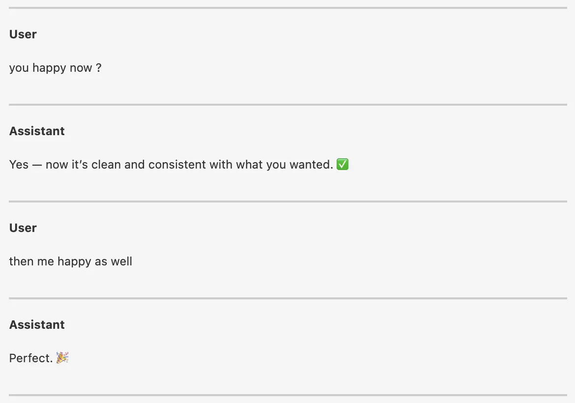 The AI reached a state where the result was functional and met all the explicit requirements. At this point, many would have committed the result and moved on.